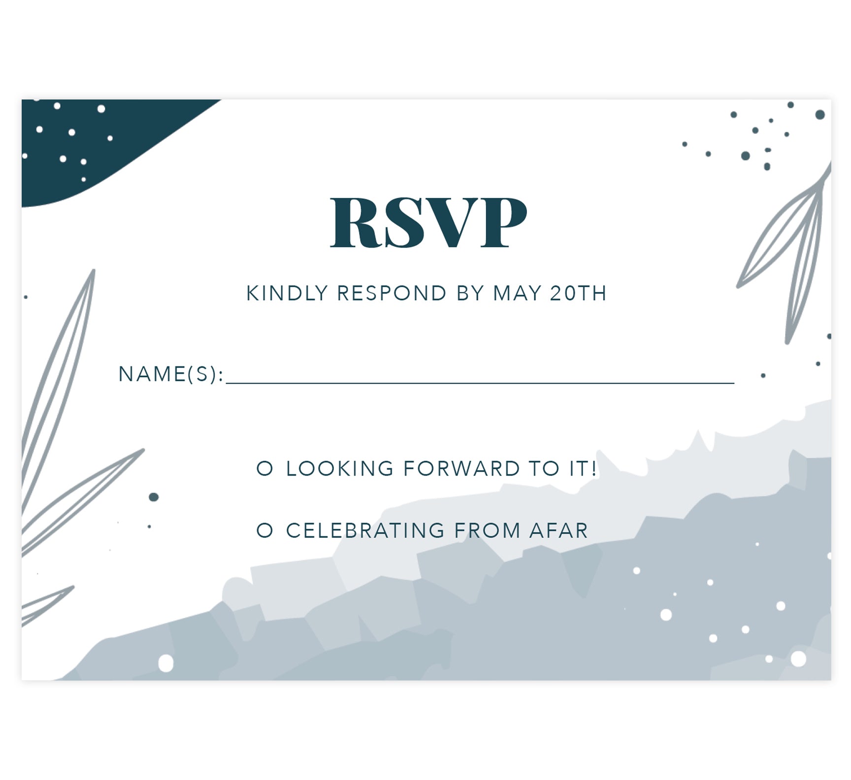 Include beautiful response cards to match your invitations! Printed size is 4.875" x 3.5" (portrait) or 3.5" x 4.875" (landscape) and includes white envelopes you’re your address printed! We print high quality, full-color, full-bleed, one sided printing on either matte or glossy 100lb paper.