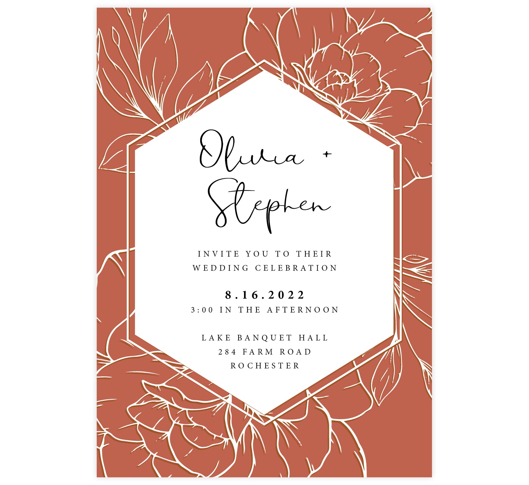 The perfect invitations for your big day! Printed size is 5" x 7" (portrait) or 7" x 5" (landscape) with standard white envelope included! We print high quality, full-color, full-bleed, one sided printing on either matte or glossy 100lb paper.