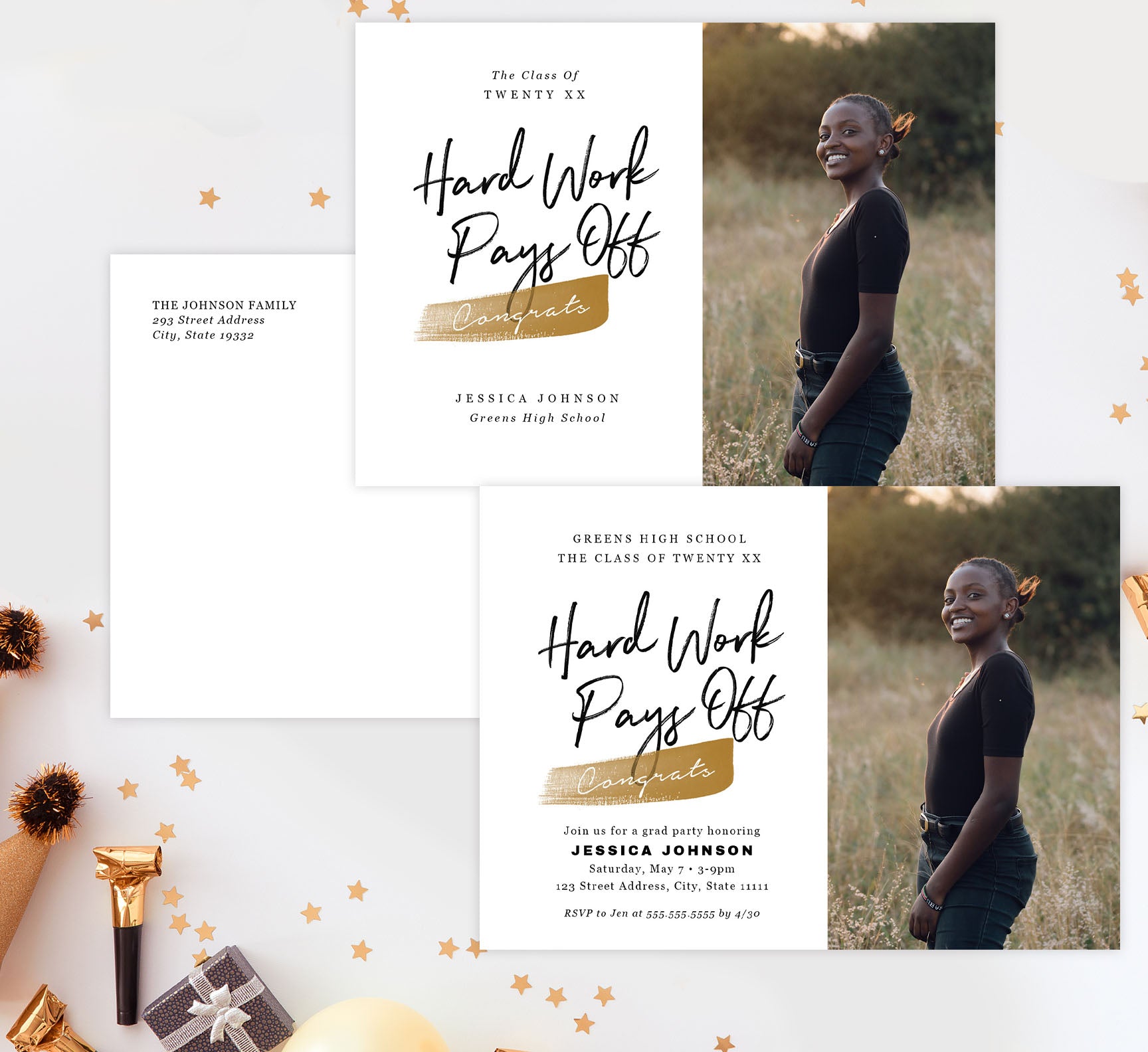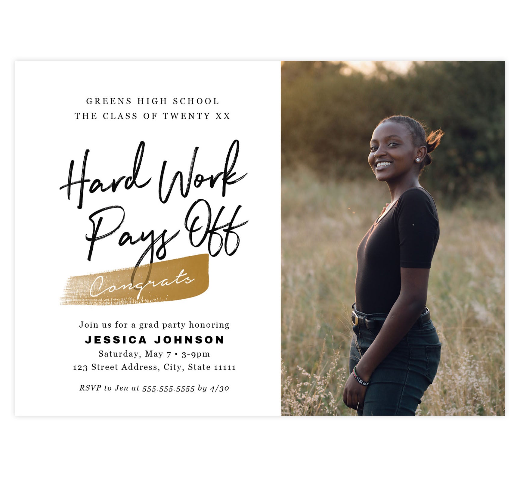 Tell your friends and family about your graduate! Printed size is 5" x 7" (portrait) or 7" x 5" (landscape). We include a standard white envelope blank or with your return address printed on it! We print high quality, full-color, full-bleed printing on glossy, 100lb paper. SKU #Grad00023