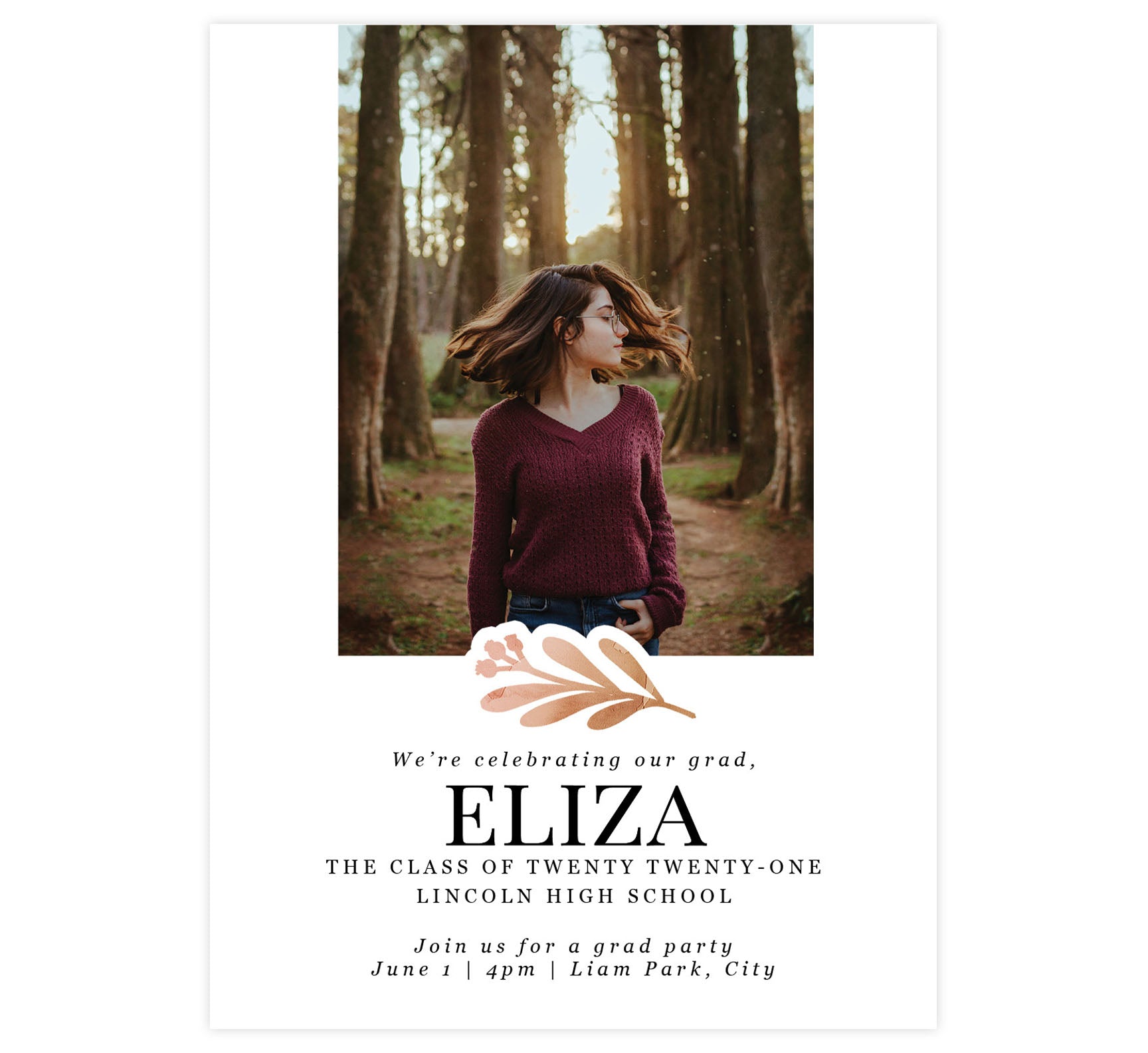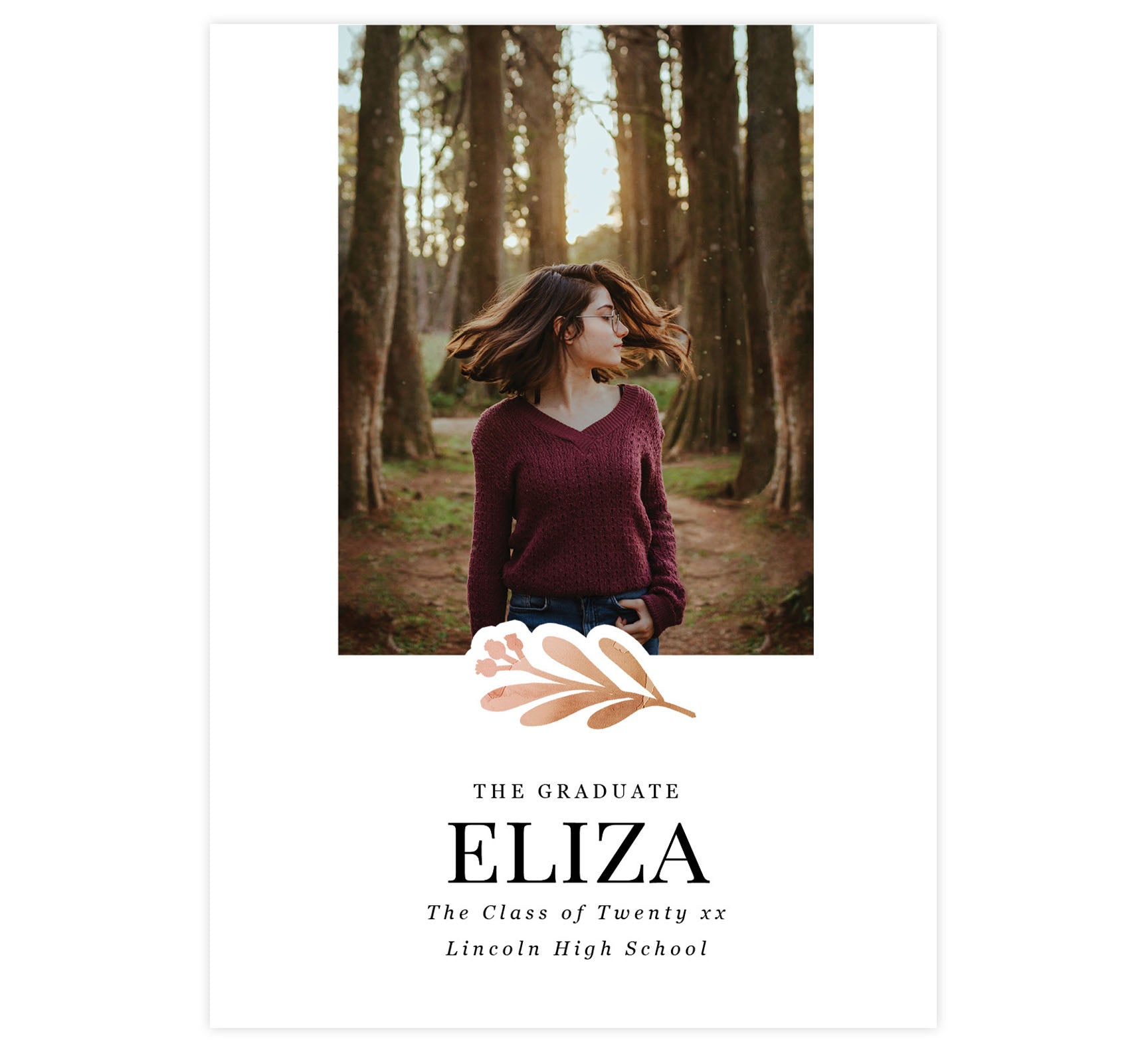 Tell your friends and family about your graduate! Printed size is 5" x 7" (portrait) or 7" x 5" (landscape). We include a standard white envelope blank or with your return address printed on it! We print high quality, full-color, full-bleed, printing on glossy, 100lb paper. SKU #Grad00024