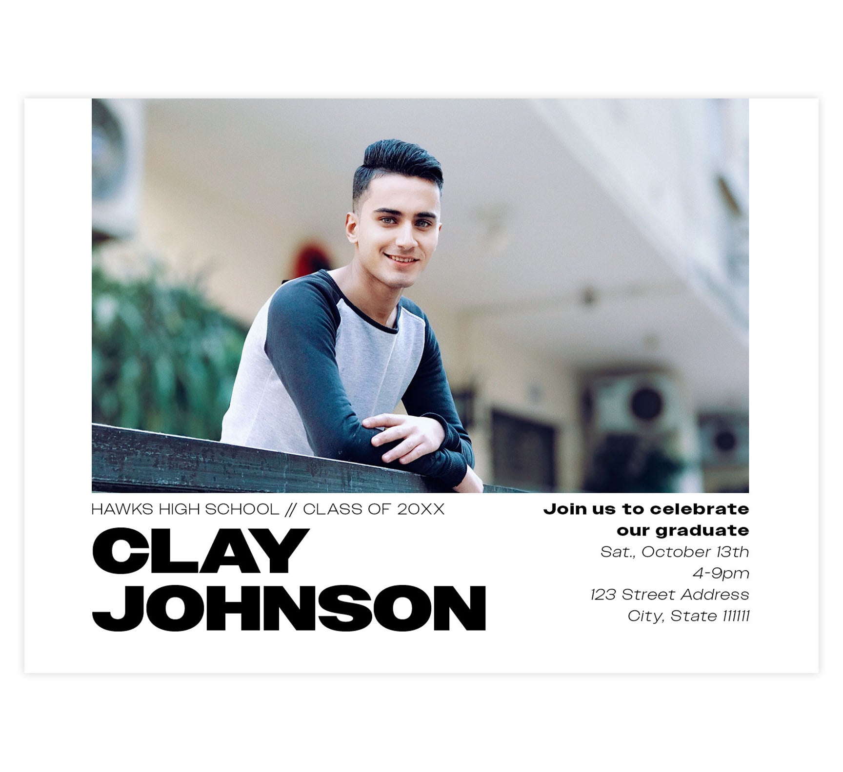 Tell your friends and family about your graduate! Printed size is 5" x 7" (portrait) or 7" x 5" (landscape). We include a standard white envelope blank or with your return address printed on it! We print high quality, full-color, full-bleed, printing on glossy, 100lb paper. SKU #Grad00022