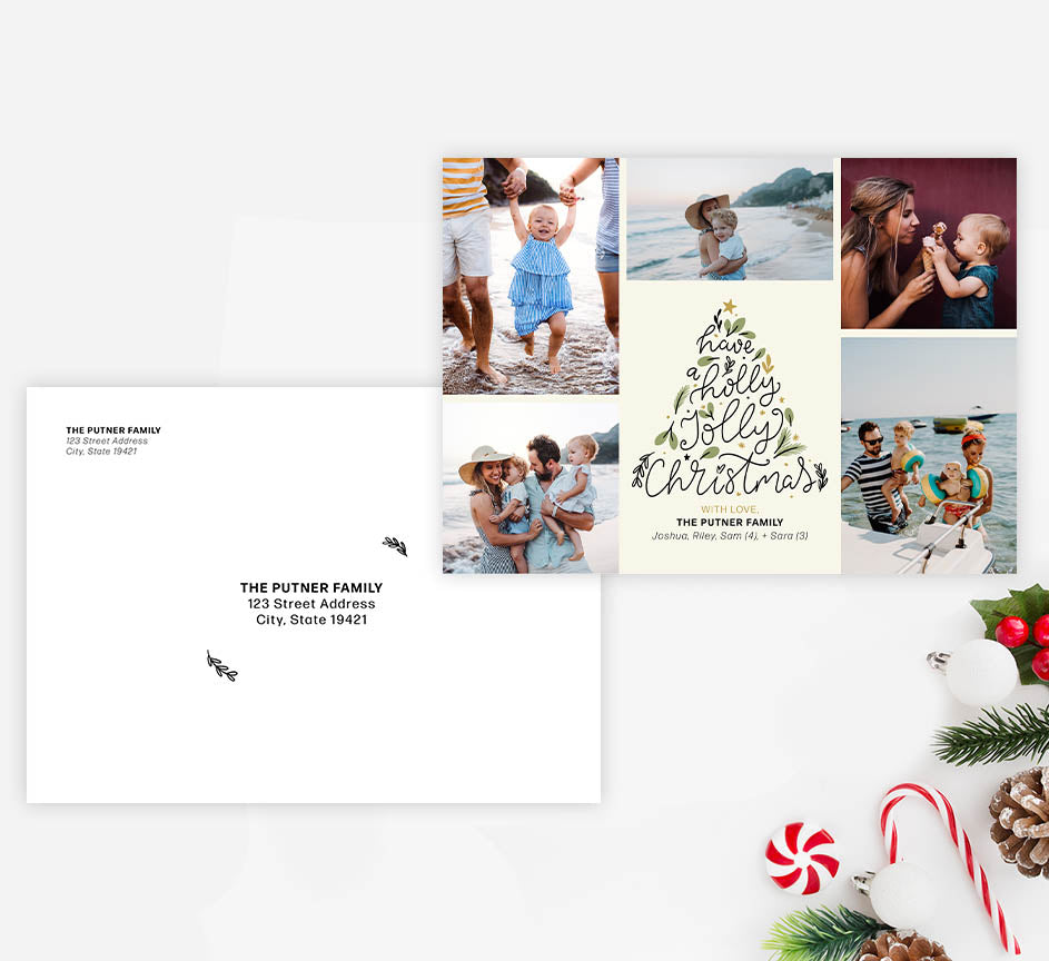 Card Details: Printed size is 5in x 7in (portrait) or 7in x 5in (landscape) and includes white envelopes with your address printed! We print high quality, full-color, full-bleed, one sided printing on matte 100lb paper. SKU# HolCrd10099.