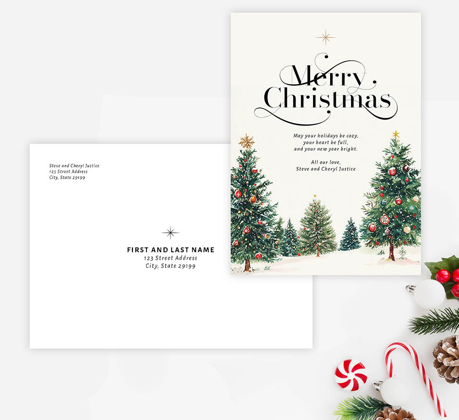 Card Details: Printed size is 5in x 7in (portrait) or 7in x 5in (landscape) and includes white envelopes with your address printed! We print high quality, full-color, full-bleed, one sided printing on matte 100lb paper. SKU# HolCrd10095.