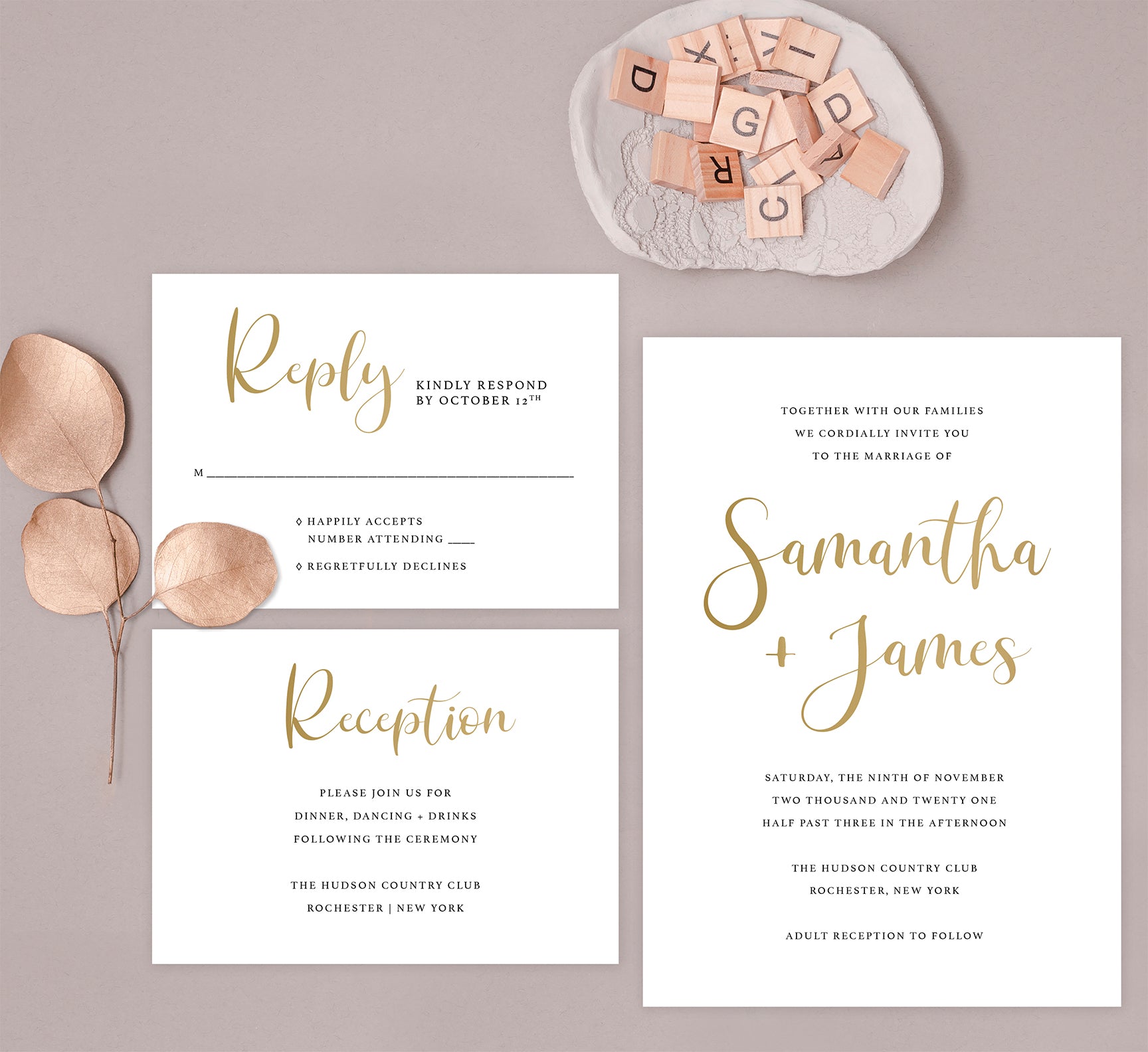 With hints of gold inlay against a white background, this Modern Celebration captures attention without being ostentatious. Featuring a combination of fonts the design carries with it a sense of sophistication and a hint of personal flare.