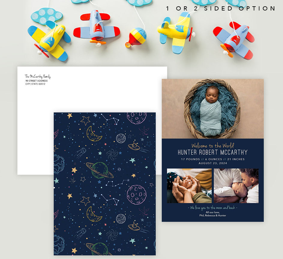 Over the Moon Baby Announcement card from Printing By Penny Lane is the perfect way to announce your new bundle of joy to your friends and family. Just upload your photo(s) and details, we will print it and ship it right out to you. All of our cards include free envelopes with your return address!