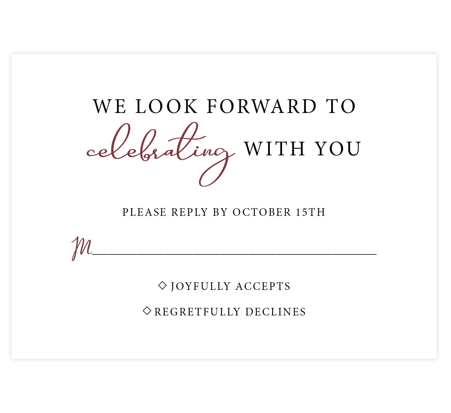 Include beautiful response cards to match your invitations! Printed size is 4.875" x 3.5" (portrait) or 3.5" x 4.875" (landscape) and includes white envelopes you’re your address printed! We print high quality, full-color, full-bleed, one sided printing on either matte or glossy 100lb paper.